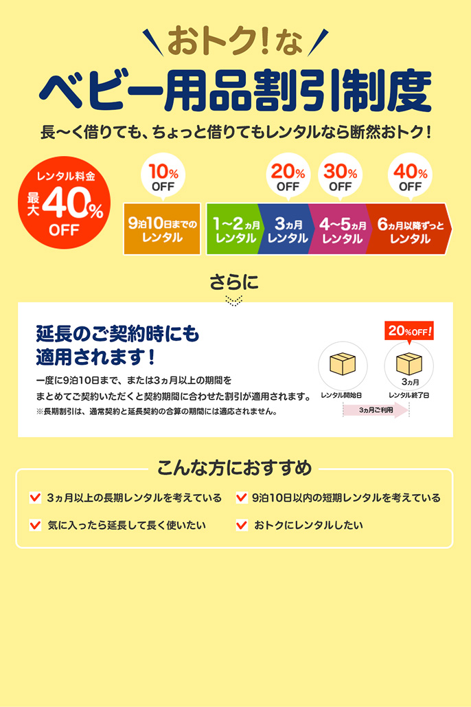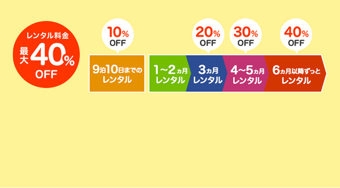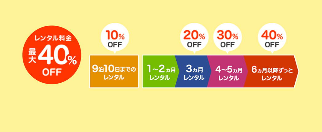 一度に9泊10日まで、または3ヵ月以上の期間をまとめてご契約いただくと契約期間に合わせた割引が適用されます。