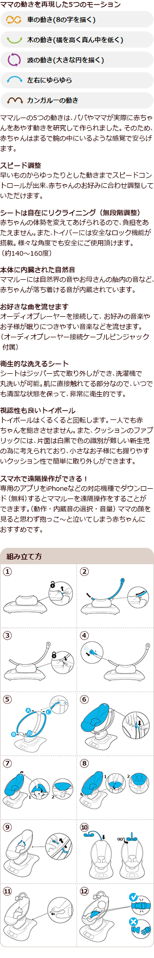 ママの抱っこを忠実に再現したUSA生まれの電動バウンサー「mamaRoo」(ママルー)。少しでも育児が楽になるようにパパママ達を助けます!